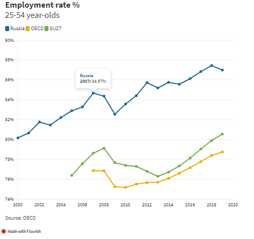 Στο μέτωπο της απασχόλησης η Ρωσία τα πηγαίνει πολύ καλύτερα από αρκετές χώρες της Ε.Ε., με τα επίπεδα να είναι πάνω από τον μέσο όρο του ΟΟΣΑ. Η εργασιακή νομοθεσία ωστόσο είναι πολύ «ευέλικτη» ακόμη και για τα δεδομένα που έχουμε βιώσει στην Ευρώπη τα τελευταία χρόνια, ενώ τα επιδόματα ανεργίας κινούνται σε πολύ χαμηλά επίπεδα. Σε επιμέρους δείκτες, όπως η ποιότητα των θέσεων εργασίας και το ύψος των μισθών είναι κοντά στον «πάτο» του ΟΟΣΑ.