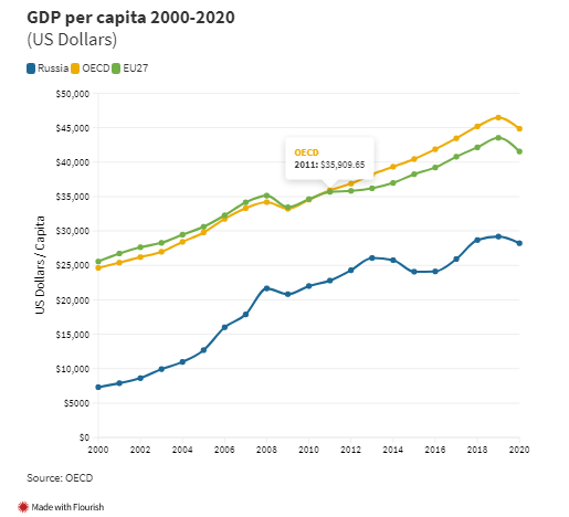 Σε τροχιά σταθερής ανόδου ήταν το κατά κεφαλήν εισόδημα των Ρώσων επί διακυβέρνησης Πούτιν. Ωστόσο σε καμία στιγμή δεν πέτυχε ο Ρώσος ηγέτης να κλείσει την ψαλίδα έναντι του μέσου όρου της Ε.Ε. ή των κρατών – μελών του ΟΟΣΑ, όπως αποκαλύπτει και το ακόλουθο γράφημα.