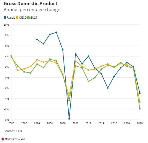 Φυσικά, όπως σημειώνει το CNBC, η πορεία της Ρωσίας δεν ήταν ρόδινη. Η Ρωσία έχει περάσει οικονομικά προβλήματα και με δική της ευθύνη – Όπως ήταν οι διεθνείς κυρώσεις τις οποίες υπέστη μετά την προσάρτηση της Κριμαίας το 2014 και την ανάμειξή της στις αμερικανικές εκλογές το 2016 – αλλά και με ευθύνη άλλων, όπως με την παγκόσμια χρηματοπιστωτική κρίση του 2008, αλλά και το κραχ των τιμών του πετρελαίου το 2014. Τελευταίο πλήγμα φυσικά, η πανδημία το 2019.