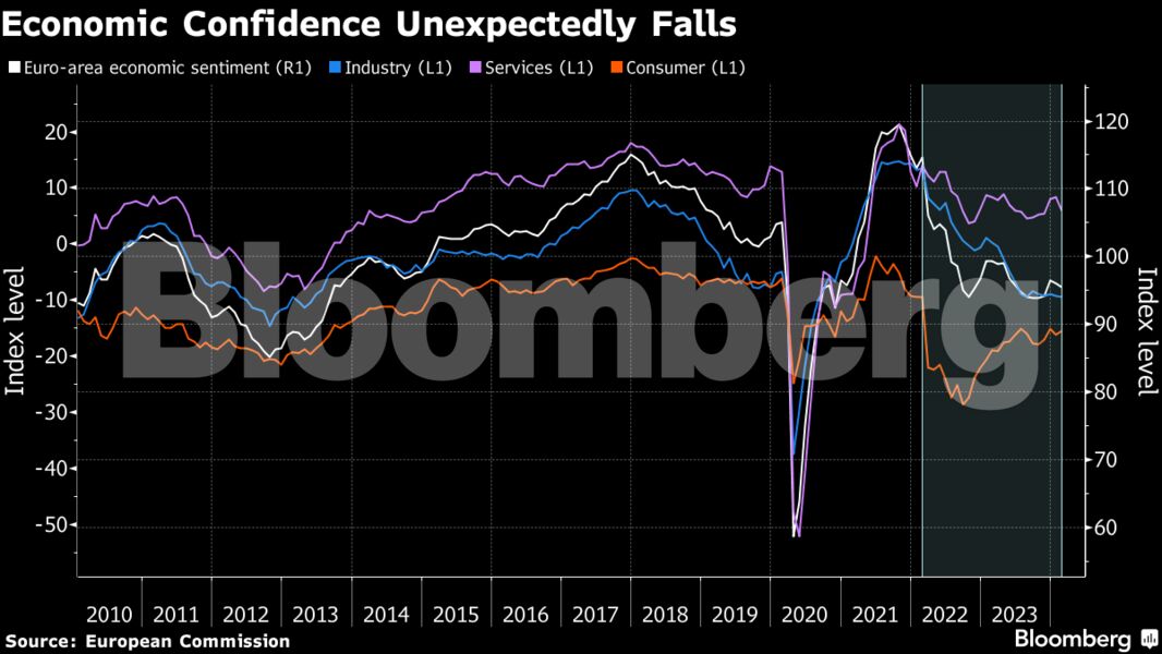 Ο δείκτης οικονομικού κλίματος που δημοσιεύθηκε την Τετάρτη από την Ευρωπαϊκή Επιτροπή υποχώρησε στο 95,4, στο χαμηλότερο επίπεδο των των τελευταίων τριών μηνών και πιο κάτω από ό,τι προέβλεπε οποιοσδήποτε οικονομολόγος σε έρευνα του Bloomberg.