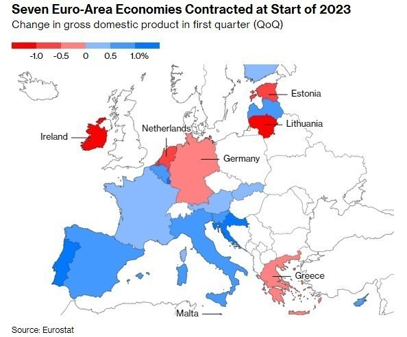 Συρρίκνωση κατά 0,1% εμφάνισε στο α’ τρίμηνο του 2023 η οικονομία της Ευρωζώνης, η οποία φαίνεται ότι πληρώνει το «μάρμαρο» του υψηλού πληθωρισμού και της ενεργειακής κρίσης.