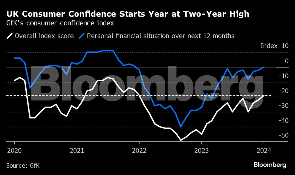 Η καταναλωτική εμπιστοσύνη στο Ηνωμένο Βασίλειο ανήλθε στο υψηλότερο επίπεδο των τελευταίων δύο ετών τον Ιανουάριο, καθώς η επιβράδυνση του πληθωρισμού κατέστησε τα νοικοκυριά πιο αισιόδοξα για τα οικονομικά τους.