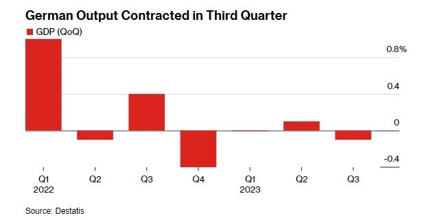 Συρρίκνωση εμφάνισε το ΑΕΠ της Γερμανίας στο γ’ τρίμηνο του 2023, αυξάνοντας τον κίνδυνο της ύφεσης στη μεγαλύτερη οικονομία της Ευρώπης.