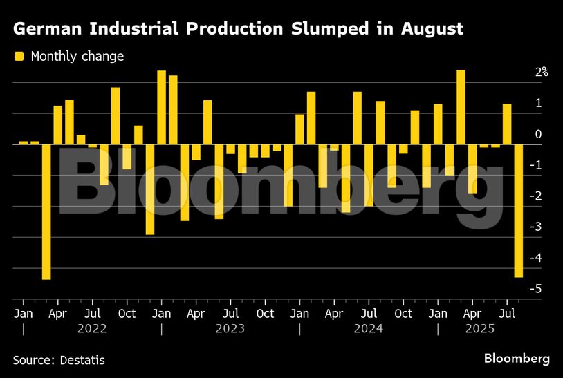 Η παραγωγή μειώθηκε κατά 4,3% τον Αύγουστο σε σχέση με τον προηγούμενο μήνα, λόγω της πτώσης κατά 18,5% στην κατασκευή αυτοκινήτων, σύμφωνα με την Destatis. Τα νούμερα είναι πολύ χειρότερα από οποιαδήποτε πρόβλεψη σε έρευνα του Bloomberg που πραγματοποιήθηκε με τη συμμετοχή 22 οικονομολόγων.