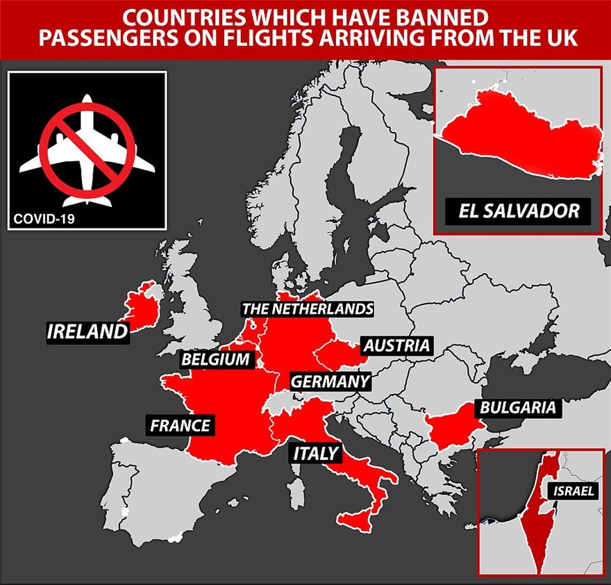 Γαλλία, Ιρλανδία, Ιταλία, Ολλανδία, Βέλγιο, Αυστρία, Βουλγαρία, Γερμανία, Φινλανδία και Δανία απαγόρευσαν αρχικά όλες τις πτήσεις που μεταφέρουν επιβάτες από το Ηνωμένο Βασίλειο για περίοδο τουλάχιστον 48 ωρών. Το Ισραήλ, η Τουρκία, το Μαρόκο, το Κουβέιτ, η Σαουδική Αραβία και το Ελ Σαλβαδόρ ακολούθησαν αργότερα, ενώ η πίεση αυξανόταν χθες το βράδυ στις Ηνωμένες Πολιτείες για να αναλάβουν δράση. Στην παραπάνω λίστα προστέθηκε και ο Καναδάς, ενώ αρκετές είναι οι χώρες που επιβάλλουν άλλου είδους αυστηρά μέτρα ελέγχου στις πτήσεις από το Ηνωμένο Βασίλειο.
