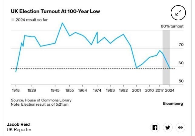 Οπως σχολιάζει το Bloomberg είναι σαφές ότι ένα μεγάλο μέρος της ψήφου μεταφράζεται σε απόρριψη των Συντηρητικών μετά από χρόνια χάους – παρά σε κύμα ενθουσιασμού για τους Εργατικούς. Επιπλέον, η αύξηση της υποστήριξης για το κόμμα Reform UK — το οποίο δεν έχει κερδίσει πολλές έδρες μέχρι στιγμής, αλλά έχει λάβει πάνω από το 15% των ψήφων — καταδεικνύει το βαθμό οργής που νιώθουν πολλοί στη Βρετανία για το παραδοσιακό δίδυμο Εργατικών-Συντηρητικών.