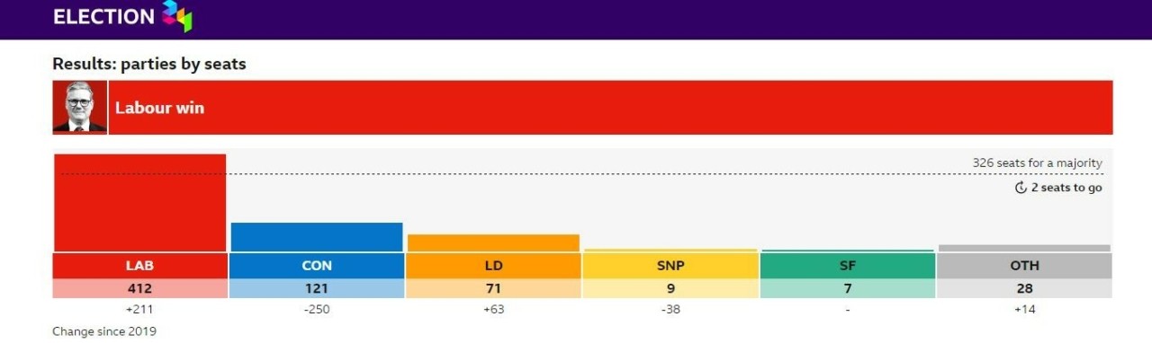 Ηδη στις 5 το πρωί (ώρα Ελλάδας) οι Εργατικοί είχαν ξεπεράσει το όριο των 326 εδρών, που συνιστά αυτοδυναμία στη Βουλή των Κοινοτήτων, αποτέλεσμα λίγα λεπτά μετά από την παραδοχή ήττας από τον απερχόμενο πρωθυπουργό Ρίσι Σούνακ.