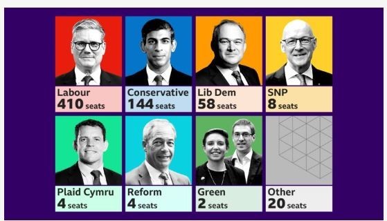 Το BBC αναφέρει ότι η αναθεωρημένη πρόβλεψή του δείχνει ότι ο Στάρμερ βρίσκεται σε πορεία για πλειοψηφία 170 εδρών, με τους Εργατικούς σε 410 έδρες και τους Συντηρητικούς σε 144 έδρες