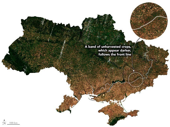 Η συγκομιδή της σποράς του περασμένου χειμώνα έφθασε το 88% στις περιοχές που δεν ελέγχονται από την ουκρανική κυβέρνηση, πάντα σύμφωνα με τη NASA. Τα χωράφια όπου δεν έγινε συγκομιδή βρίσκεται κυρίως κατά μήκος των μετώπων.