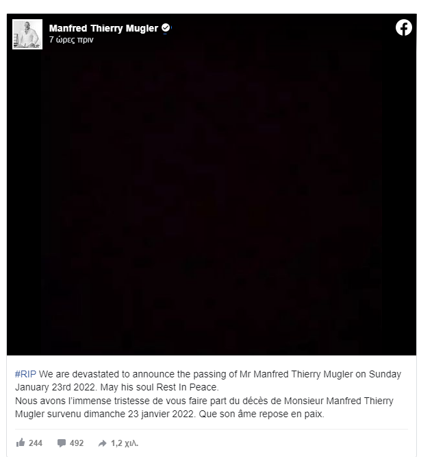 «Με απέραντη θλίψη πρέπει να σας ενημερώσουμε για τον θάνατο του Μάνφρεντ Τιερί Μιγκλέρ, ο οποίος επήλθε την Κυριακή 23η Ιανουαρίου 2022», ανέφερε ο πράκτοράς τουσε ανακοίνωσή του η οποία αναρτήθηκε στον επίσημο λογαριασμό του Γάλλου μόδιστρου στο facebook