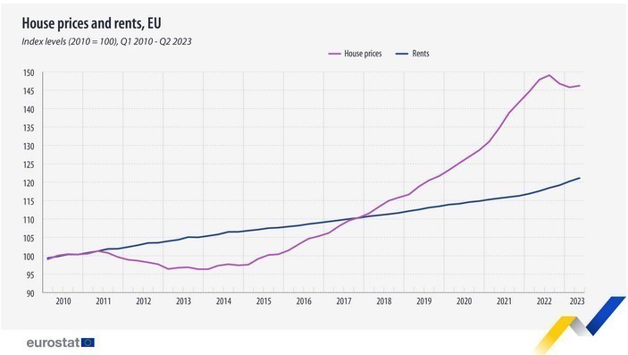 Συνολικά από το 2010 έως το δεύτερο τρίμηνο του 2023 οι τιμές των κατοικιών στην ΕΕ έχουν αυξηθεί κατά 46% και των ενοικίων κατά 21%, αναφέρει η Eurostat. Μάλιστα, σε χώρες όπως η Εσθονία, η Ουγγαρία, η Λιθουανία, το Λουξεμβούργο και η Αυστρία οι τιμές έχουν κυριολεκτικά υπερδιπλασιαστεί.