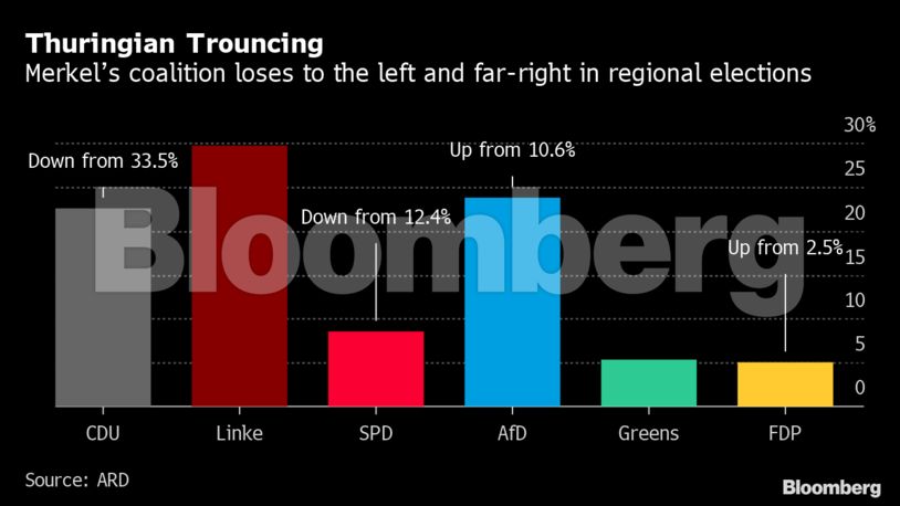 Έδαφος έχασαν οι Χριστιανοδημοκράτες (CDU) της Άνγκελα Μέρκελ στις περιφερειακές εκλογές που διεξήχθησαν την Κυριακή στο ανατολικό κρατίδιο της Θουριγγίας καθώς κατετάγησαν στην τρίτη θέση.