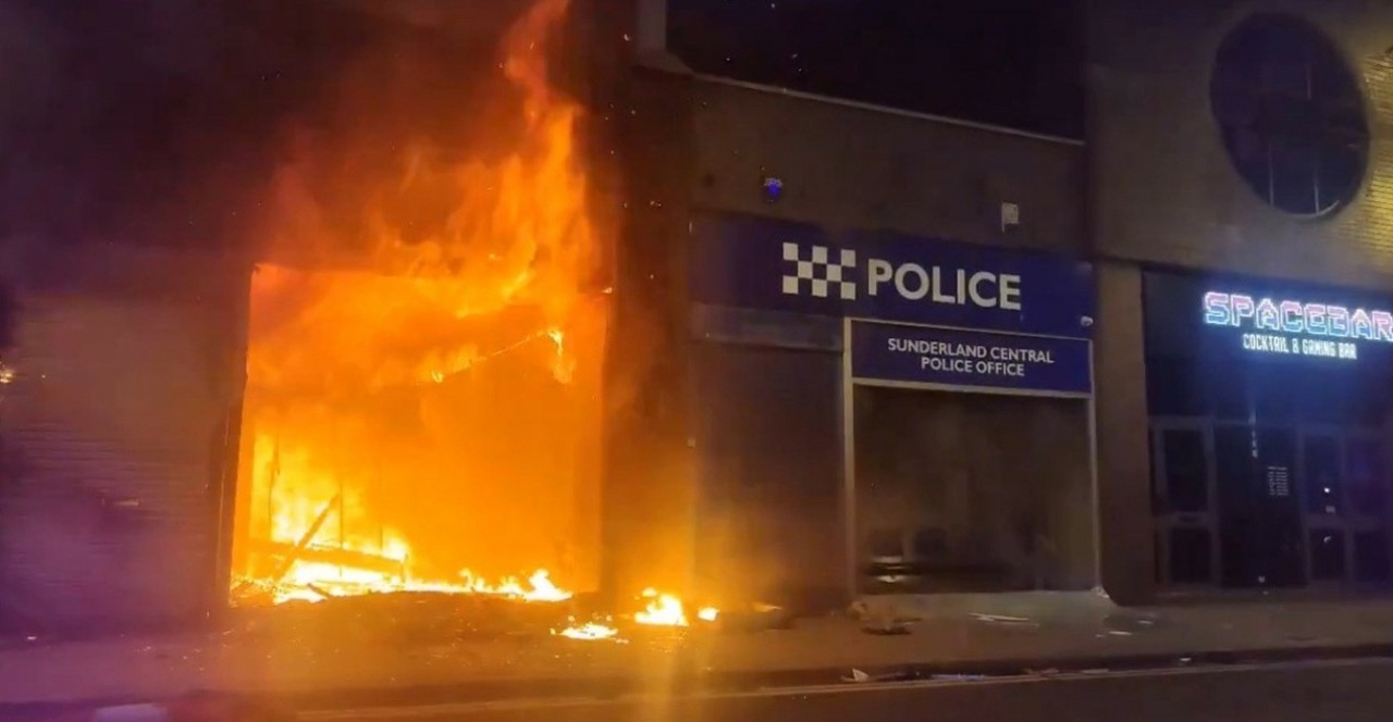 Το αστυνομικό τμήμα του Σάντερλαντ στο Waterloo Place λεηλατήθηκε και πυρπολήθηκε. Η αστυνομία που αντιμετωπίζει τις ταραχές στο Σάντερλαντ υφίσταται «σοβαρή βία», ανέφερε η αστυνομία της Νορθούμπρια.