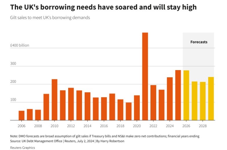 Ωστόσο, το οικονομικό έτος 2024-25 θα είναι το δεύτερο υψηλότερο για την έκδοση κρατικού χρέους που έχει καταγραφεί ποτέ, με 278 δισεκατομμύρια λίρες (350 δισεκατομμύρια δολάρια), ενώ ο λογαριασμός των τόκων μόνο για το χρέος της Βρετανίας διαμορφώθηκε πέρυσι στο ιλιγγιώδες ποσό των 111 δισεκατομμυρίων λιρών, δηλαδή περίπου το 4,4% του ΑΕΠ.
