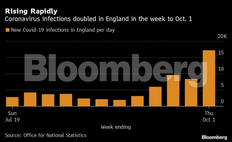 Το ποσοστό μολύνσεων από κοροναϊό στην Αγγλία σχεδόν διπλασιάστηκε την τελευταία εβδομάδα, δημιουργώντας έντονες ανησυχίες ότι μια νέα έξαρση της πανδημίας εξαπλώνεται σε ολόκληρη τη χώρα.