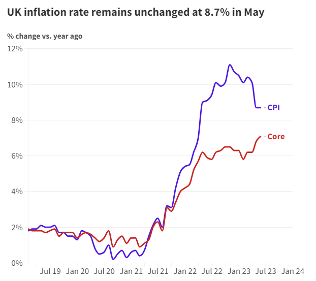 Υψηλότερος του αναμενόμενου ήταν ο πληθωρισμός στο Ηνωμένο Βασίλειο ήταν θερμότερος, καθώς οι τιμές καταναλωτή αυξήθηκαν κατά 8,7% σε ετήσια βάση, αμετάβλητες σε σχέση με τον προηγούμενο μήνα.
