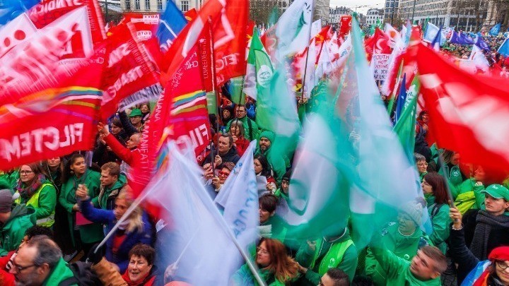 Βέλγοι, Ιταλοί, Γάλλοι, Ισπανοί, έκαναν πορεία δίπλα-δίπλα στους δρόμους των Βρυξελλών, πίσω από τα χρώματα των συνδικάτων τους, κόκκινο, μπλε ή πράσινο.