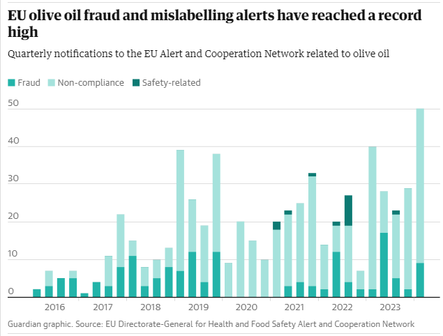Καθώς η τιμή έχει εκτοξευθεί, αυξήθηκε και ο αριθμός των «διασυνοριακών κοινοποιήσεων στην ΕΕ», οι οποίες περιλαμβάνουν λανθασμένη σήμανση, πιθανή απάτη και υποθέσεις ασφάλειας που αφορούν μολυσμένα έλαια.