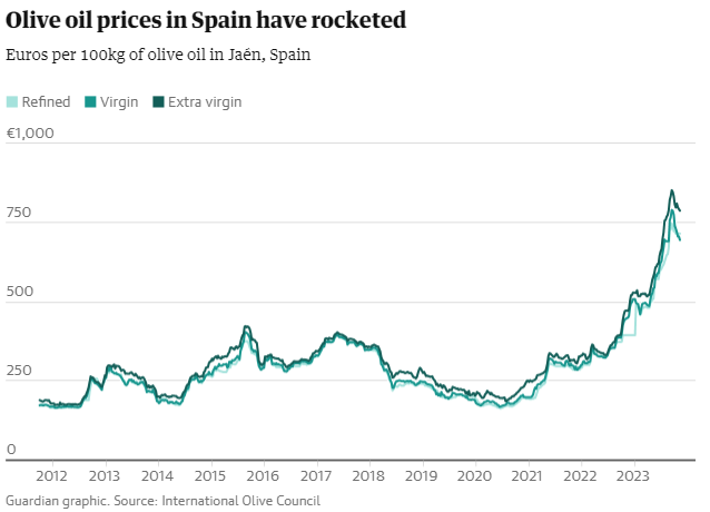 Το κόστος του ελαιολάδου έχει υπερδιπλασιαστεί από το 2018 με την παραγωγή να πλήττεται από τα ακραία καιρικά φαινόμενα που προκαλούνται από την κλιματική κρίση και άλλους παράγοντες, μεταδίδει ο Guardian.