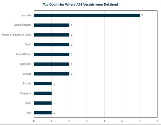 Υπήρξαν συνολικά 465 πλοία που κρατήθηκαν στο τέταρτο τρίμηνο σύμφωνα με τα παρακάτω καθεστώτα: Paris MoU, Tokyo MoU και USCG. Από αυτά τα κρατημένα πλοία, μόνο 22 ήταν πλοία με τάξη ABS. Για την περίοδο από 1 Οκτωβρίου 2024 έως 31 Δεκεμβρίου 2024, οι κορυφαίες κατηγορίες για κρατήσεις από τον Έλεγχο Κρατών Λιμένων (PSC) στα πλοία ABS στα δεδομένα του Paris MoU, του Tokyo MoU και της Ακτοφυλακής των Η.Π.Α. (USCG) αναφέρονται παρακάτω.