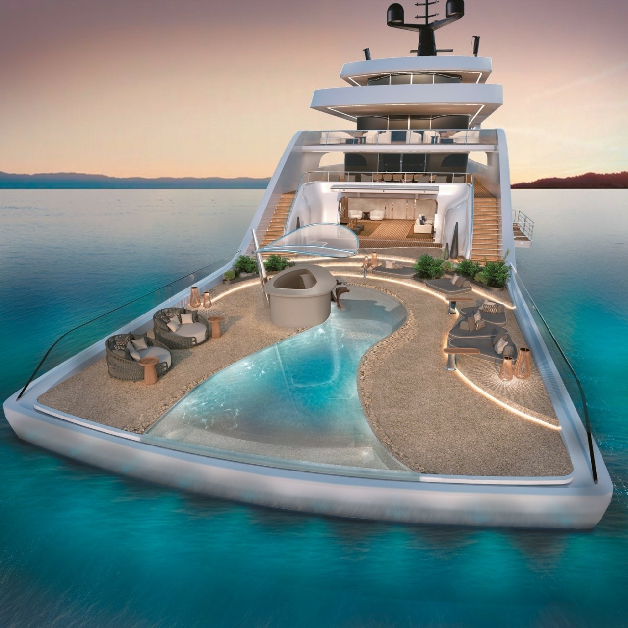 Κεντρικό στοιχείο του «The Real Beach» είναι η πισίνα. Δεν πρόκειται για ένα παραδοσιακό deck pool, αλλά για έναν χώρο οργανικής μορφής, σχεδιασμένο να θυμίζει το σβήσιμο της ακτογραμμής στη θάλασσα. Δεν επικάθεται πάνω στο κατάστρωμα, αλλά αναδύεται από αυτό. Είναι αρχιτεκτονική και ταυτόχρονα εμπειρία.