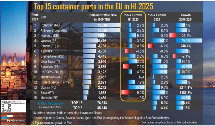 Σύμφωνα με την ανάλυση του Theo Notteboom, μέλους του PortEconomics, η εικόνα που διαμορφώνεται συνδυάζει στοιχεία συνέχειας με σημαντικές μετατοπίσεις στην ιεραρχία των ευρωπαϊκών λιμένων.