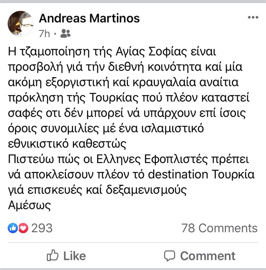 Κάλεσμα στους Έλληνες εφοπλιστές να αποκλείσουν την Τουρκία από επισκευές και δεξαμενισμούς απηύθυνε o εφοπλιστής Ανδρέας Μαρτίνος μετά την απόφαση Ερντογάν να κάνει τζαμί την Αγιά Σοφιά.