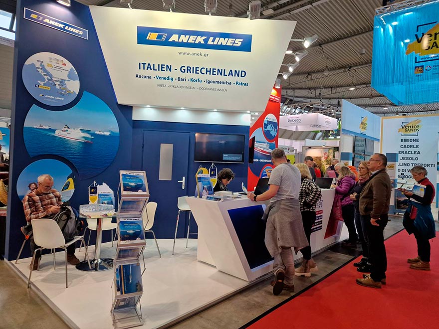 Η ANEK LINES, πιστή στη δέσμευσή της να αναδεικνύει διεθνώς την ελληνική φιλοξενία αλλά και την ποιότητα του εθνικού τουριστικού μας προϊόντος, συμμετείχε με μεγάλη επιτυχία στις διεθνείς εκθέσεις τουρισμού CMT, στη Στουτγάρδη της Γερμανίας (14-22/01/23), F.RE.E. στο Μόναχο της Γερμανίας (22-26/02/23) και ITB στο Βερολίνο της Γερμανίας (07-9/03/23).