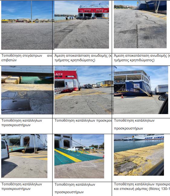 Πύλη Ε7-Ε8 Ακτή Τζελέπη (Δρομολογιακές Γραμμές Κυκλάδων): 1. Τοποθέτηση κατάλληλων προσκρουστήρων σε όλο το μέτωπο καθώς και στις γωνίες των κρηπιδωμάτων εξυπηρέτησης δρομολογημένων πλοίων. 2. Βελτίωση σήμανσης και κατεύθυνσης προς τις πύλες εισόδου/εξόδου. 3. Αποκατάσταση μπιντών οι οποίες έχουν αποκοπεί.
