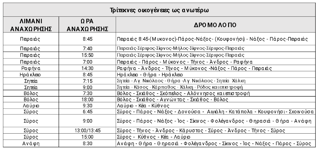 30% έκπτωση στα εισιτήρια επιστροφής επιβάτη για τους τρίτεκνους με την ταυτόχρονη έκδοση εισιτηρίων μετ’ επιστροφής στα δρομολόγια όπως αναφέρονται στον παρακάτω πίνακα. (Για τους πολύτεκνους ισχύει ήδη η έκπτωση 50%).