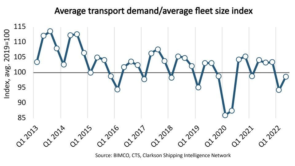 Για να καταδείξει την εξέλιξη της σχέσης μεταξύ του μεγέθους του στόλου και της ζήτησης μεταφορών, η BIMCO δημιούργησε έναν δείκτη ζήτησης μεταφορών/μεγέθους στόλου με μέσο όρο το 2019 ως γραμμή βάσης.