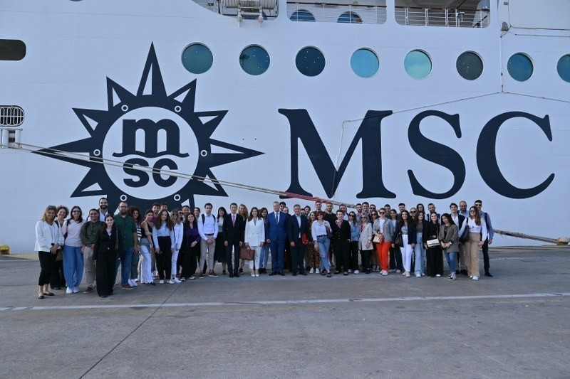 Με οικοδεσπότες την Διευθύντρια Ανατολικής Μεσογείου της CLIA, Μαρία Δεληγιάννη και την Αντιπρόεδρο Βιωσιμότητας & ESG της MSC Cruises, Linden Coppell, και με την τιμητική παρουσία του Προέδρου του Οργανισμού Λιμένος Πειραιώς Yu Zenggang, οι φοιτητές των Προγραμμάτων MSc in Shipping Management and MSc in Ports and Coastal Economy του Πανεπιστημίου Πειραιώς ξεναγήθηκαν στους χώρους του MSC Splendida προκειμένου να γνωρίσουν από κοντά τι είναι η κρουαζιέρα. Τους φοιτητές συνόδευαν οι Καθηγητές του Τμήματος Ναυτιλιακών Σπουδών του Πανεπιστημίου Πειραιώς, κ.κ. Θάνος Πάλλης και Άγγελος Παντουβάκης.