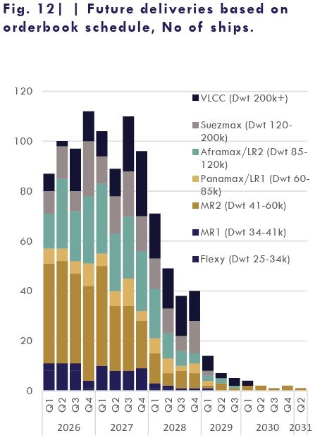 Η εικόνα γίνεται ακόμη πιο καθαρή αν δει κανείς το χρονοδιάγραμμα παραδόσεων. Η μεγάλη μάζα των νέων πλοίων έρχεται το 2026–27, ενώ στη συνέχεια οι ρυθμοί υποχωρούν αισθητά. Αυτό δημιουργεί ένα “timing game” για την αγορά: το 2026 μπορεί να παραμείνει λειτουργικά ισχυρό, όμως όσο τα πλοία καθελκύονται, η αγορά αρχίζει να προεξοφλεί τη μελλοντική πίεση.