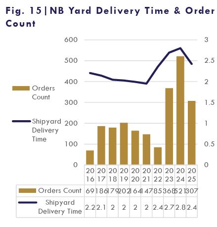 Παράλληλα, οι παραδόσεις συγκεντρώνονται σε λίγα ναυπηγεία, με μεγαλύτερους χρόνους κατασκευής και αυξημένο κίνδυνο καθυστερήσεων ή “bunching”. Όλα αυτά κάνουν την αύξηση της προσφοράς λιγότερο γραμμική απ’ όσο φαίνεται στα χαρτιά.