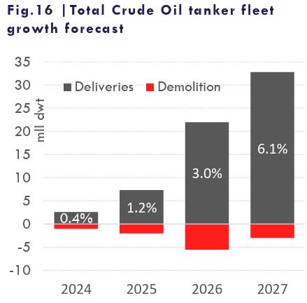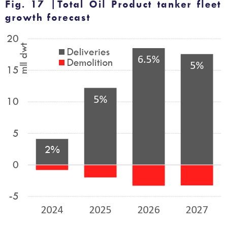 Η Optima ξεχωρίζει καθαρά τη δυναμική μεταξύ dirty και clean αγοράς. Στα crude tankers, η αύξηση του στόλου γίνεται πιο αισθητή από το 2026 και κορυφώνεται το 2027, καθιστώντας την απορρόφηση και την πειθαρχία στη χρήση χωρητικότητας κρίσιμους παράγοντες.