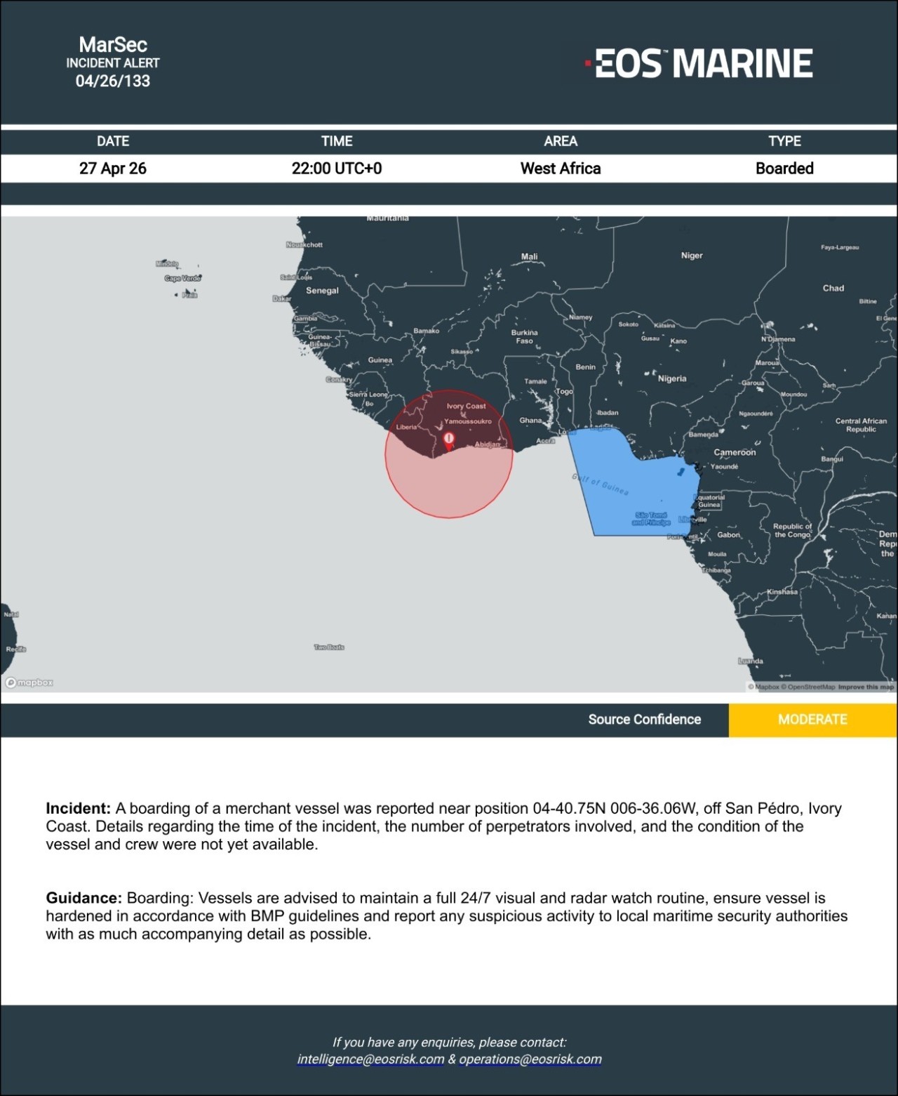 Το πρώτο συμβάν σημειώθηκε στις 27 Απριλίου 2026, στις 22:00 (UTC), στα ανοικτά του Σαν Πέδρο στο Ελεφαντοστού, στη θαλάσσια περιοχή της Δυτικής Αφρικής. Σύμφωνα με την αναφορά, άγνωστοι επιβιβάστηκαν σε εμπορικό πλοίο σε συντεταγμένες περίπου 04°40.75N και 006°36.06W.