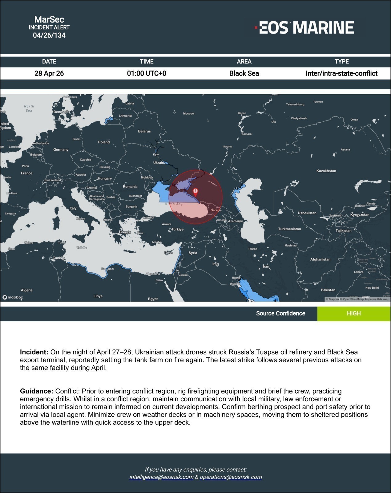 Η εξέλιξη αυτή εντείνει τους κινδύνους για τη ναυσιπλοΐα στη Μαύρη Θάλασσα, καθώς συνδέεται άμεσα με τη συνεχιζόμενη σύγκρουση στην Ουκρανία και τη Ρωσία. Οι επιθέσεις σε ενεργειακές υποδομές κοντά σε θαλάσσιες οδούς αυξάνουν τον κίνδυνο παράπλευρων επιπτώσεων για εμπορικά πλοία. Η EOS συνιστά σε πλοία που εισέρχονται σε περιοχές σύγκρουσης να προχωρούν σε ενισχυμένα μέτρα ασφαλείας: προετοιμασία πυροσβεστικού εξοπλισμού, εκπαίδευση πληρωμάτων για καταστάσεις έκτακτης ανάγκης, συνεχή επικοινωνία με στρατιωτικές και λιμενικές αρχές, καθώς και περιορισμό της έκθεσης του πληρώματος σε ανοιχτά καταστρώματα.