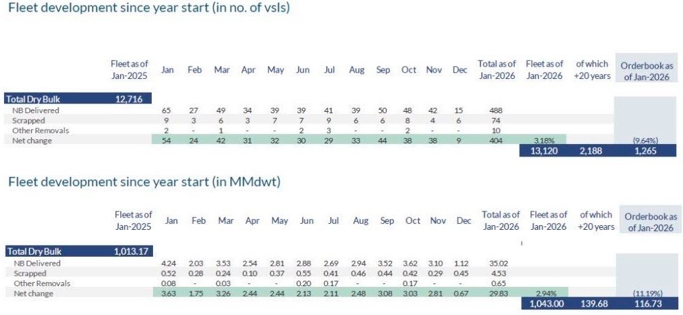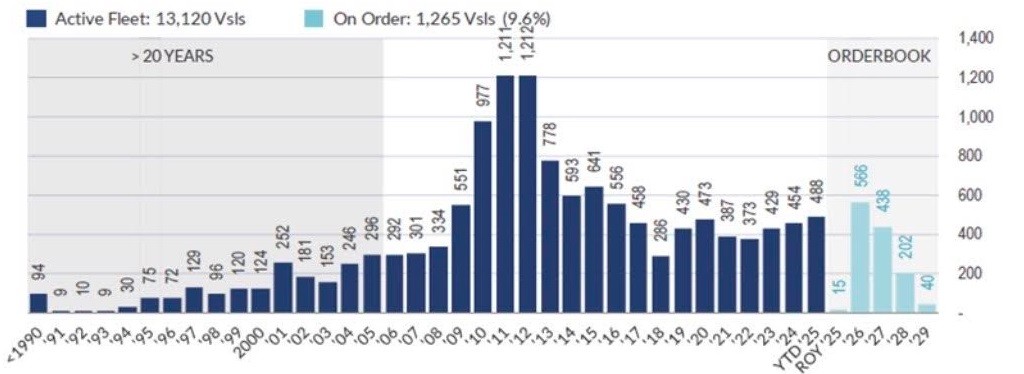 Σύμφωνα με τα στοιχεία της Allied, ο ενεργός στόλος ξηρού φορτίου άνω των 20.000 dwt ανέρχεται πλέον σε 13.120 πλοία, συνολικής χωρητικότητας 1,043 δισ. dwt. Την ίδια στιγμή, το βιβλίο παραγγελιών αριθμεί 1.265 πλοία ή 116,73 εκατ. dwt, αντιστοιχώντας στο 9,6% του υφιστάμενου στόλου σε αριθμό πλοίων. Οι προγραμματισμένες παραδόσεις κατανέμονται σε 566 πλοία το 2026, 438 το 2027 και 246 από το 2028 και μετά, επιβεβαιώνοντας ότι η εισροή νέας χωρητικότητας θα συνεχιστεί για αρκετά χρόνια ακόμη.