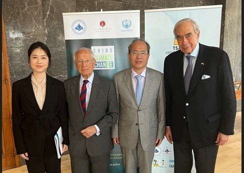 Είπε ακόμη: «Η αντιμετώπιση της κλιματικής αλλαγής απαιτεί επίσης από τη ναυτιλιακή βιομηχανία να μειώσει τις εκπομπές διοξειδίου του άνθρακα. Η Κίνα και η Ελλάδα θα μπορούσαν να ενισχύσουν την επικοινωνία και τη συνεργασία σε τομείς όπως η κατασκευή πράσινων πλοίων, η κατασκευή πράσινων λιμένων και η επιστημονική έρευνα. Απολαμβάνουμε επίσης μεγάλες δυνατότητες στον συγκεκριμένο τομέα. Το C3 (Chios Climate Chance) μπορεί να γίνει C5, που σημαίνει Chios Climate Chance with Chinese Contribution.