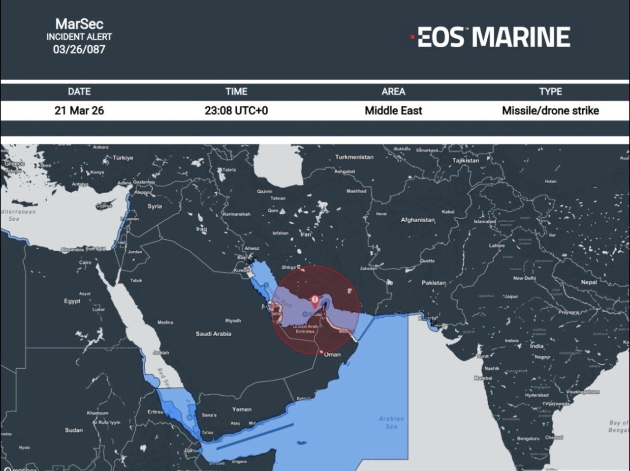 Σύμφωνα με αναφορά των αρμόδιων αρχών και της εταιρείας EOS Risk Group το συμβάν σημειώθηκε περίπου 15 ναυτικά μίλια βόρεια της Σάρτζα, όταν πλοίαρχος bulk carrier ανέφερε έκρηξη από άγνωστο βλήμα σε κοντινή απόσταση από το πλοίο. Όπως επισημαίνεται, όλα τα μέλη του πληρώματος είναι ασφαλή, ενώ δεν έχουν αναφερθεί ζημιές που να θέτουν σε άμεσο κίνδυνο το σκάφος.