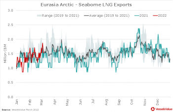 Σύμφωνα με την έρευνα της Vessels Value δύο ρωσικές περιοχές της Αρκτικής και του Ειρηνικού συνεισφέρουν ημερησίως δύο εκατομμύρια κυβικά μέτρα φυσικό αέριο και παραμένει στα ίδια επίπεδα σε σύγκριση με τον μέσο όρο της τελευταίας τριετίας.