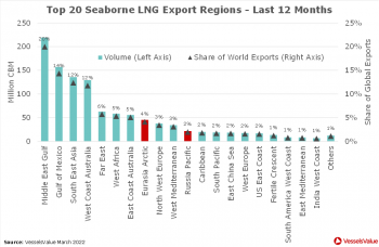 Αν και η Ρωσία είναι μεγάλη εξαγωγική χώρα σε LNG παρόλα αυτά υπάρχουν άλλες περιοχές που την ξεπερνούν. Πρόκειται για τον Κόλπο της Μέσης Ανατολής με 20%, τον Κόλπο του Μεξικού με 14%, τη Νοτιοανατολική Ασία με 12% και τη δυτική ακτή της Αυστραλίας επίσης με 12%.