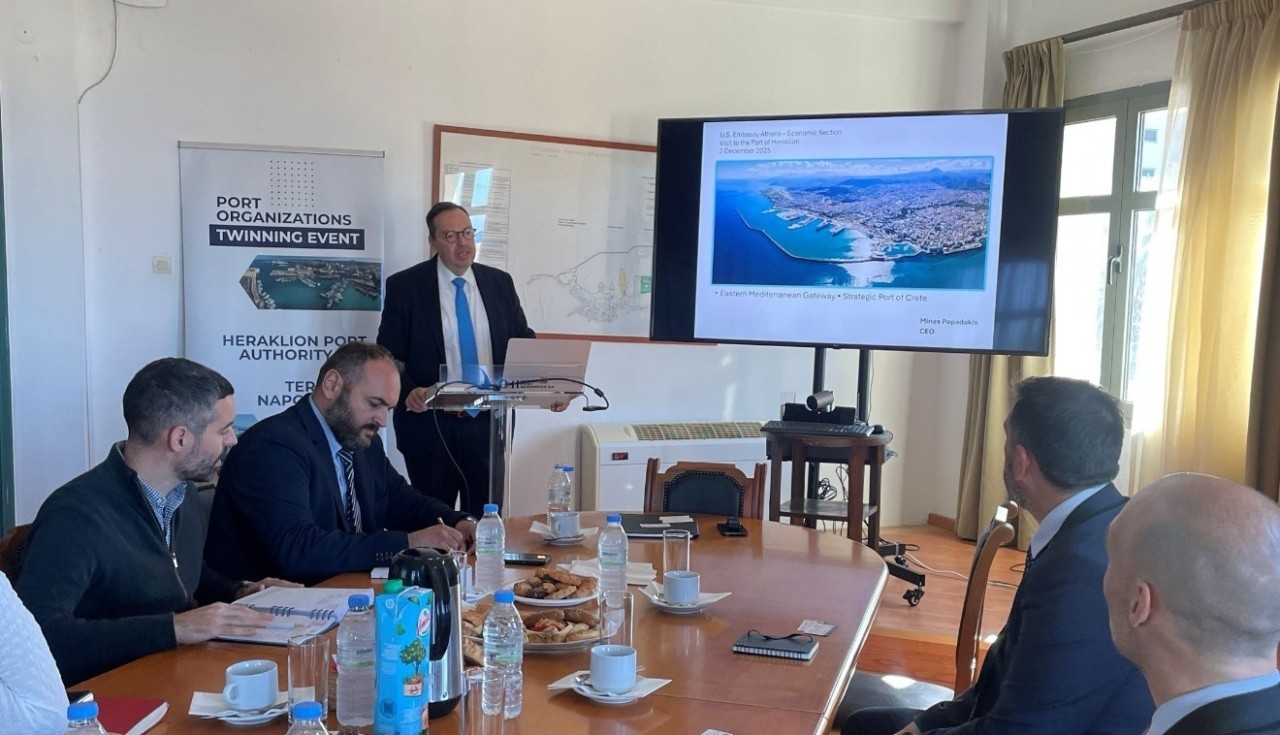 Αντιπροσωπεία του Οικονομικού Τμήματος της Πρεσβείας των Ηνωμένων Πολιτειών στην Αθήνα επισκέφθηκε την Τρίτη 2 Δεκεμβρίου 2025 το Λιμάνι Ηρακλείου, στο πλαίσιο της ενίσχυσης των διμερών οικονομικών και εμπορικών σχέσεων. Επικεφαλής της αποστολής ήταν ο Brian Timm-Brock, Γενικός Γραμματέας του Οικονομικού Τμήματος, και ο Timothy Haynes, Αναπληρωτής Οικονομικός Σύμβουλος.