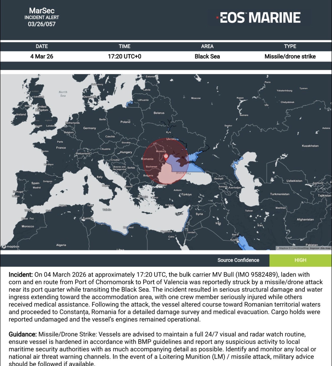 Επίθεση με πύραυλο ή μη επανδρωμένο αεροσκάφος (drone) δέχθηκε bulk carrier ενώ έπλεε στη Μαύρη Θάλασσα, σύμφωνα με ειδοποίηση ναυτιλιακής ασφάλειας της EOS Marine.