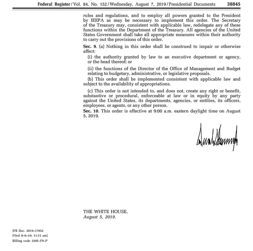 Τον Αύγουστο του 2019 ο Τραμπ εξέδωσε κι άλλη Εκτελεστική Οδηγία με περισσότερες λεπτομέρειες όσον αφορά τις κυρώσεις σε βάρος της Βενεζουέλας. Οπως αναφέρεται, μπλοκάρει-παγώνει περιουσιακά στοιχεία της κυβέρνησης Μαδούρο, όλοι οι κάτοικοι-υπήκοοι ΗΠΑ απαγορεύεται να κάνουν οποιαδήποτε συναλλαγή με τη Βενεζουέλα, ενώ οι non-U.S. persons έχουν τον κίνδυνο επιβολής των απαγορεύσεων (sanctions) εάν συνδράμουν ή υποστηρίξουν την κυβέρνησης της Βενεζουέλας – συμπεριλαμβανομένης της μεταφοράς αγαθών από ή προς πρόσωπα-οντότητες του Δημοσίου της Βενεζουέλας.