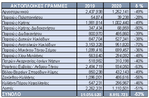 Τα στατιστικά στοιχεία που έχουν δημοσιευτεί από την Ελληνική Στατιστική Υπηρεσία (ΕΛΣΤΑΤ), επιβεβαιώνουν τη μεγάλη μείωση στη μεταφορική κίνηση επιβατών και οχημάτων το 2020 σε σχέση με το 2019. Όσον αφορά τους επιβάτες έφτασε το -53% ενώ όσον αφορά τα οχήματα στο σύνολό τους (αυτοκίνητα και φορτηγά) έφτασε στο -28%. (Πίνακας 2).