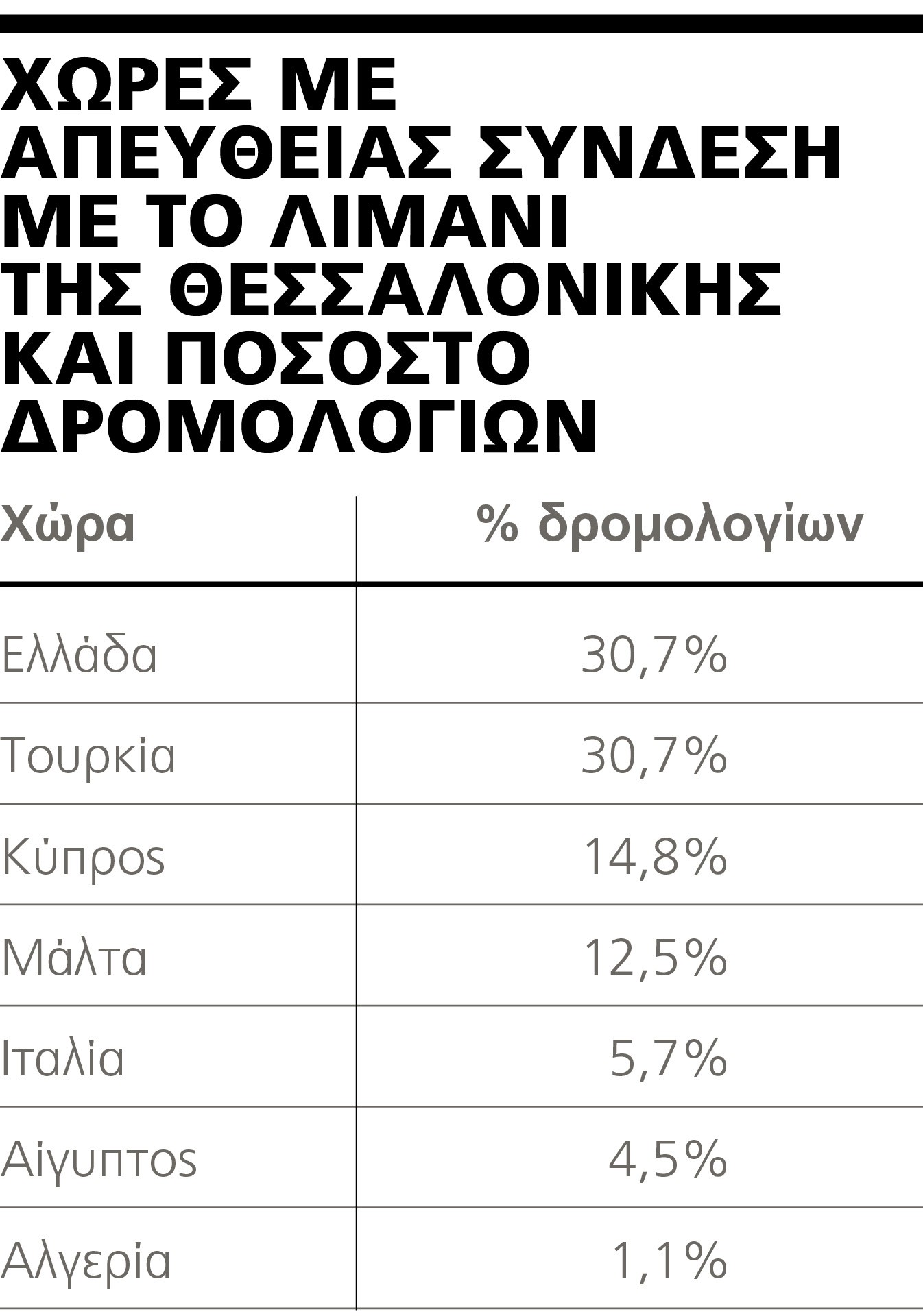 Το λιμάνι της Θεσσαλονίκης συνδέεται άμεσα με 15 λιμένες -προηγούμενος ή επόμενος λιμένας προσέγγισης- οι οποίοι ανήκουν σε επτά χώρες, τρεις περισσότερους λιμένες σε σχέση με το 2018. Η ανάλυση των λιμένων με τους οποίους συνδέεται άμεσα η Θεσσαλονίκη δείχνει ότι το 30,7% των προσεγγίσεων στη Θεσσαλονίκη έχουν ως προέλευση/προηγούμενο λιμάνι ή προορισμό/επόμενο λιμάνι τον Πειραιά. Ακολουθούν η Λεμεσός με 14,8% και το Μάρσασλοκ (Μάλτα) με 12,5%. Σε σχέση με τα αντίστοιχα δεδομένα του 2018, ο αριθμός των συνδέσεων με τον Πειραιά έχει μειωθεί αισθητά, ενώ έχουν αυξηθεί οι συνδέσεις με το Μάρσασλοκ στη διαχείριση του οποίου συμμετέχει η Terminal Link, η οποία είναι μέρος της κοινοπραξίας που διαχειρίζεται το λιμάνι της Θεσσαλονίκης.