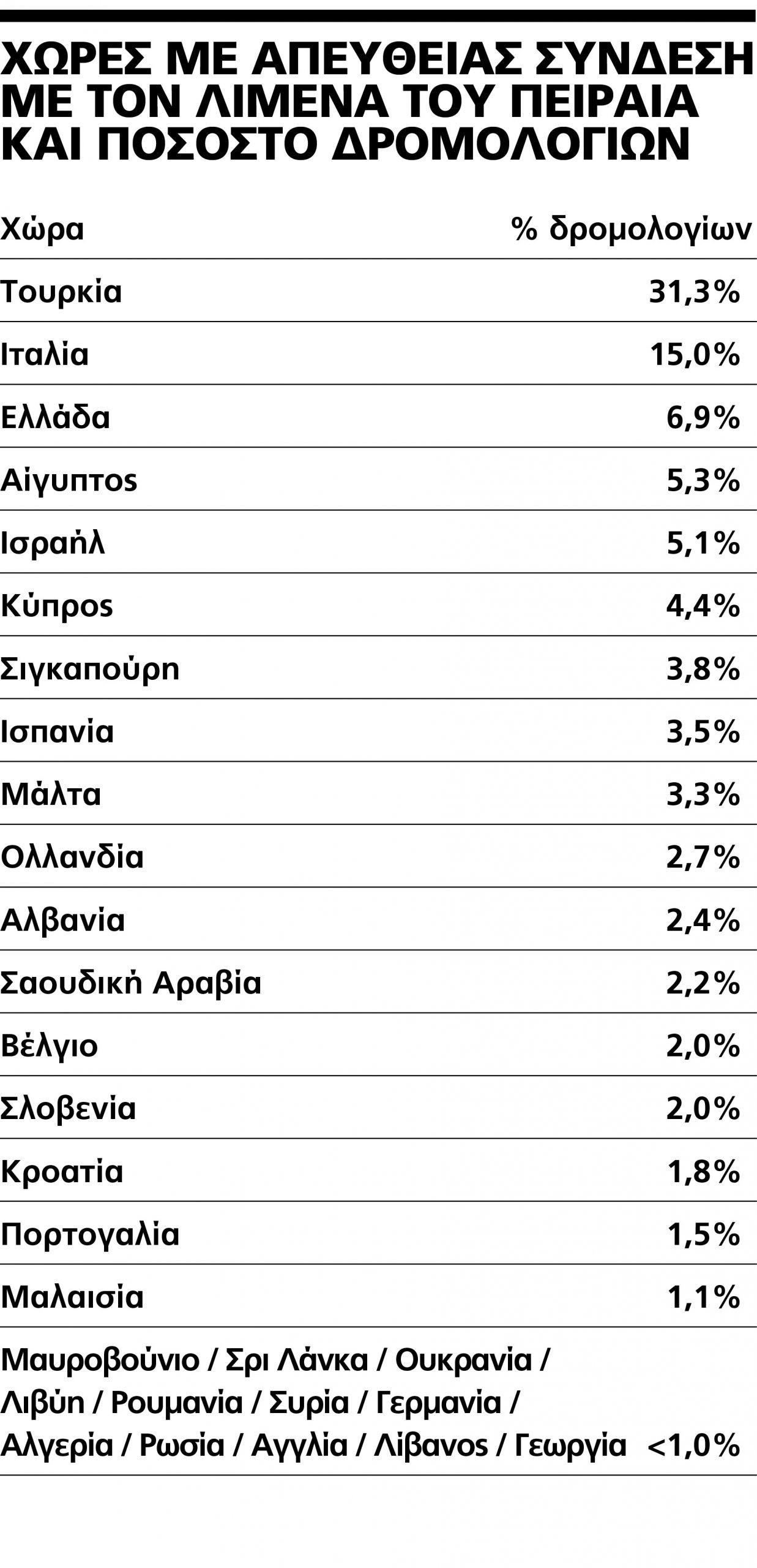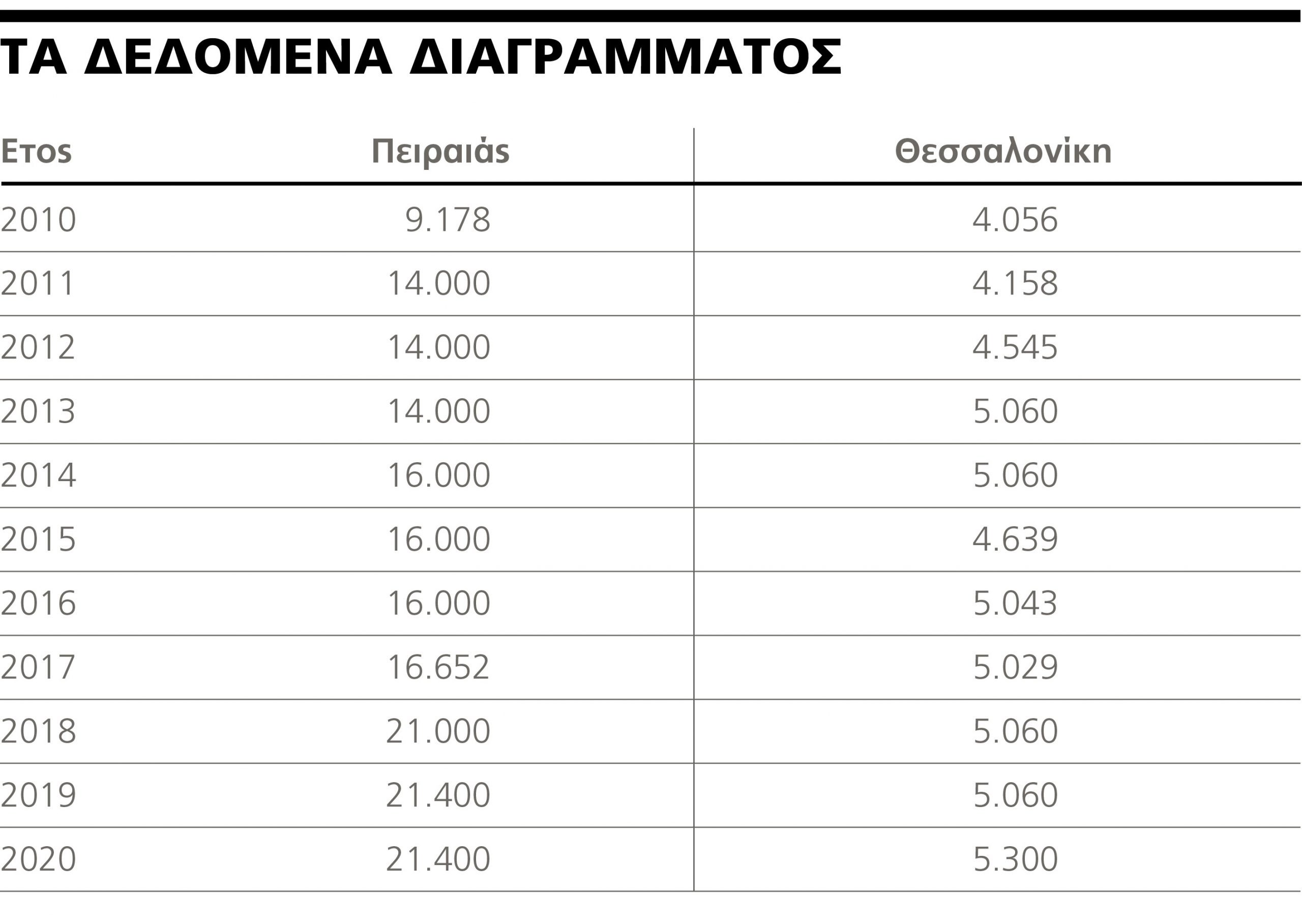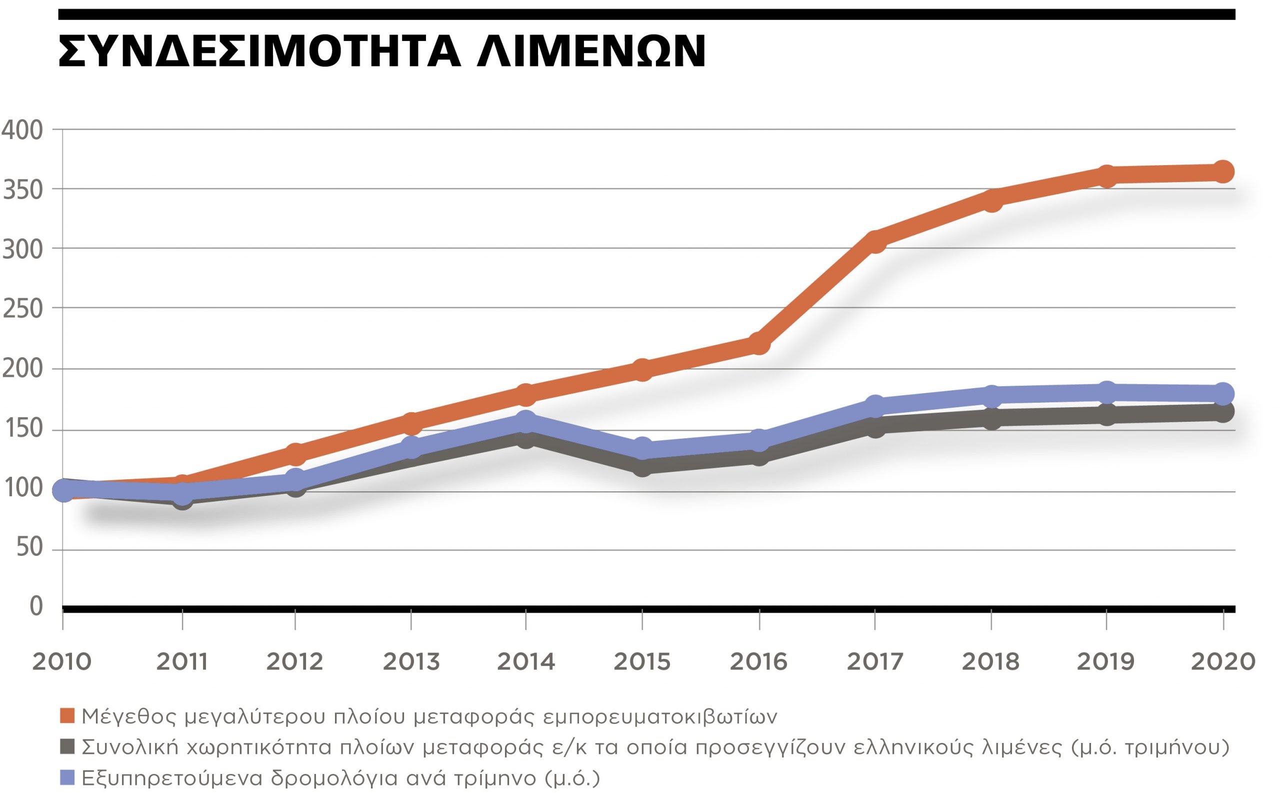 Σύμφωνα με την έρευνα, «στο τέλος της δεκαετίας που ολοκληρώθηκε (2010-2020), τα εξυπηρετούμενα δρομολόγια τακτικών γραμμών ήταν 79% περισσότερα σε σύγκριση με το 2010. Η συνολική χωρητικότητα πλοίων μεταφοράς εμπορευματοκιβωτίων τα οποία προσεγγίζουν τους ελληνικούς λιμένες είναι 66% μεγαλύτερη από τις αρχές της δεκαετίας.