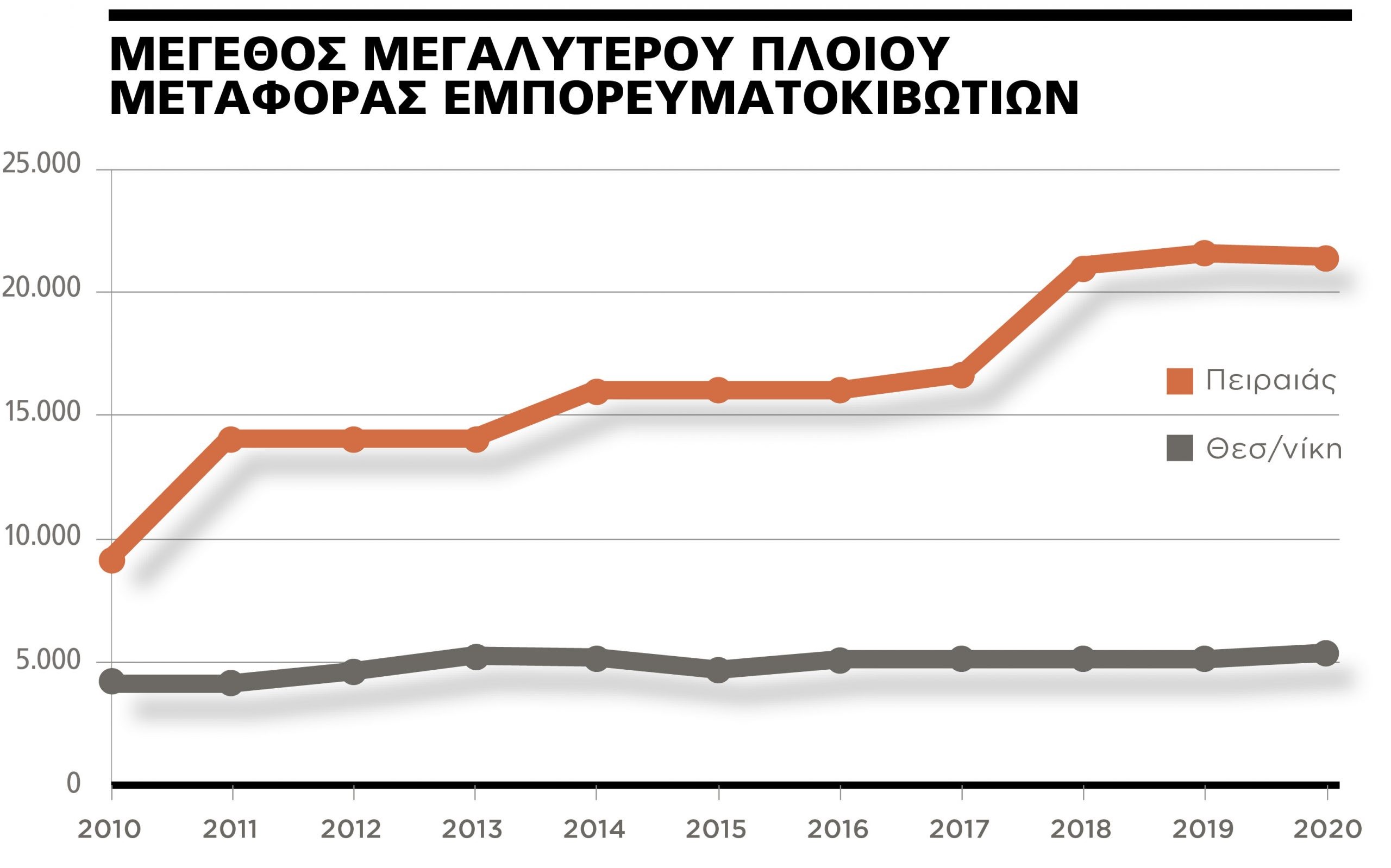 H εντυπωσιακότερη αλλαγή των τελευταίων ετών συνδέεται με το μέγεθος των πλοίων μεταφοράς εμπορευματοκιβωτίων τα οποία εξυπηρετούν οι δύο ελληνικοί λιμένες – και ιδιαίτερα ο Πειραιάς. Το 2010 το μέγεθος του μεγαλύτερου πλοίου μεταφοράς εμπορευματοκιβωτίων ήταν μικρότερο των 10.000 ΤΕUs. Το 2018 ο λιμένας του Πειραιά εξυπηρέτησε για πρώτη φορά πλοία μεταφοράς εμπορευματοκιβωτίων με χωρητικότητα μεγαλύτερη των 20.000 ΤEUs.