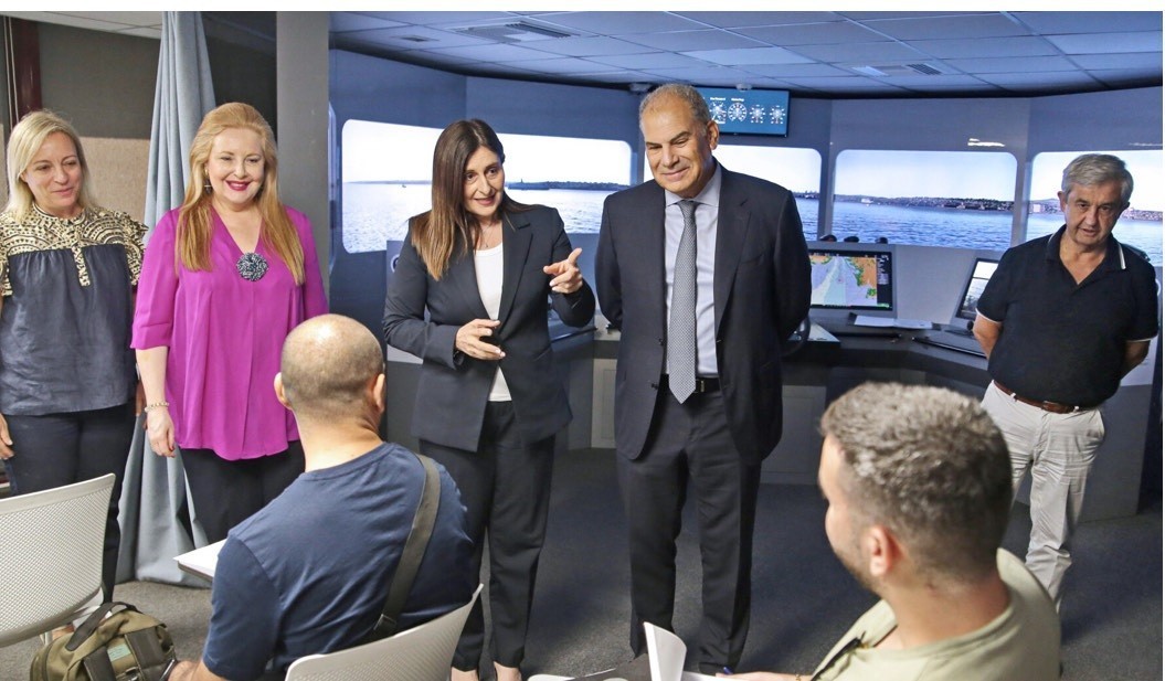 Η Υφυπουργός και οι συνεργάτες της ξεναγήθηκαν στον χώρο του προσομοιωτή γέφυρας της HELMEPA, όπου συνομίλησαν με αξιωματικούς του Εμπορικού Ναυτικού που συμμετείχαν σε σεμινάριο.
